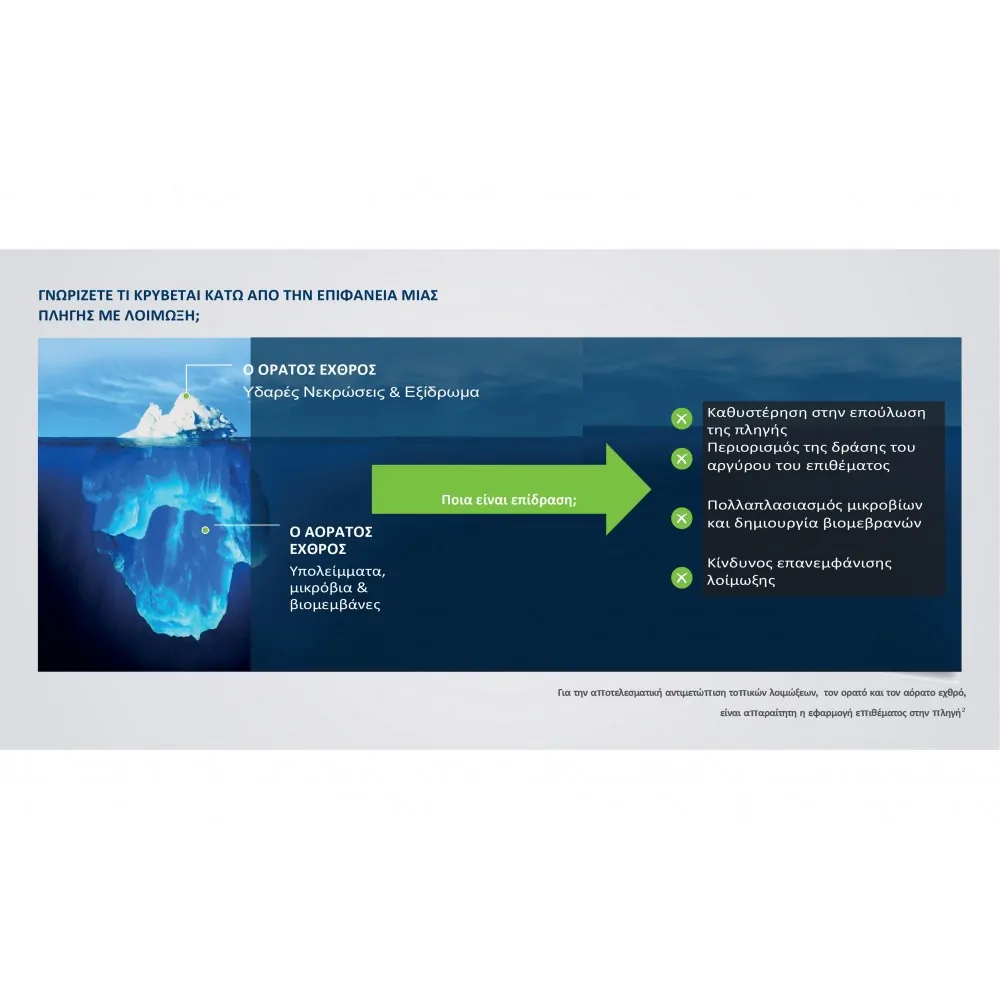 Αποδεδειγμένη αποτελεσματικότητα και καταπολέμηση τοπικών λοιμώξεων. Αφαιρεί τα υπολείμματα όπως υδαρές νεκρώσεις, εξίδρωμα, μικρόβια και βιομεβράνες.