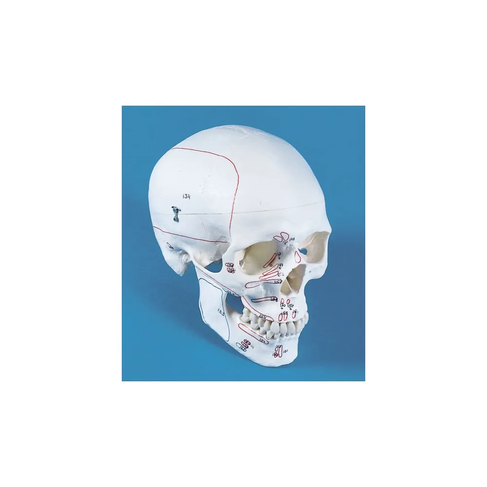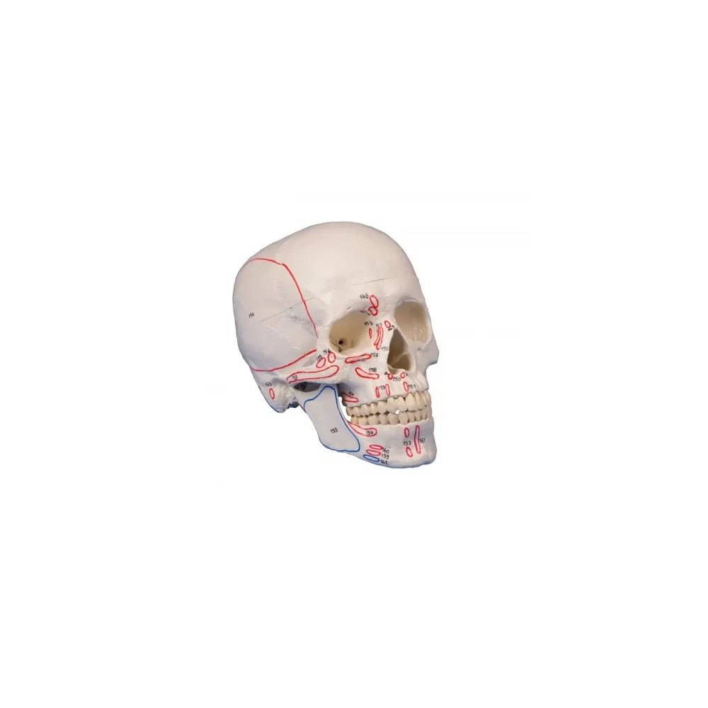 Η κατασκευή αυτού του προπλάσματος κρανίου από την Γερμανική Erler Zimmer, έγινε με τα αυστηρότερα κριτήρια ώστε να είναι πιστή αναπαράσταση ενός πραγματικού ανθρώπινου κρανίου και να καλύπτει ακόμα και τα αυστηρότερα στάνταρ στον τομέα της εκπαιδευτικής διαδικασίας. Αυτό συνεπάγεται ότι οι αναλογίες, η αίσθηση του υλικού, οι ανατομικές λεπτομέρειές και δομές είναι παρούσες κάνοντας τη διδασκαλία της ανατομίας της περιοχής εξαιρετικά ενδιαφέρουσα και πλήρη. Σε αυτά τα χαρακτηριστικά αν προσθέσουμε και το γεγονός ότι είναι χρωματισμένες πάνω στο κρανίο οι εκφύσεις και οι καταφύσεις μυών, τότε καταλαβαίνει κανείς γιατί το συγκεκριμένο πρόπλασμα ανήκει στα πλέον ευπώλητα της εταιρείας μας.