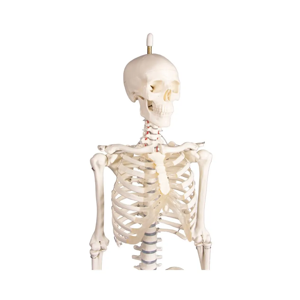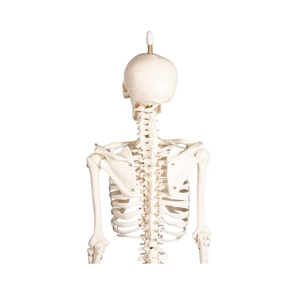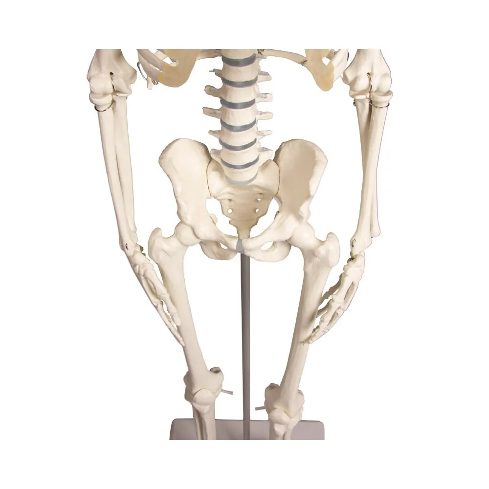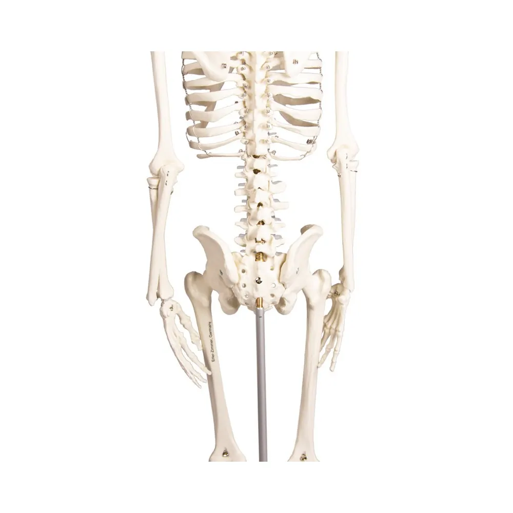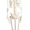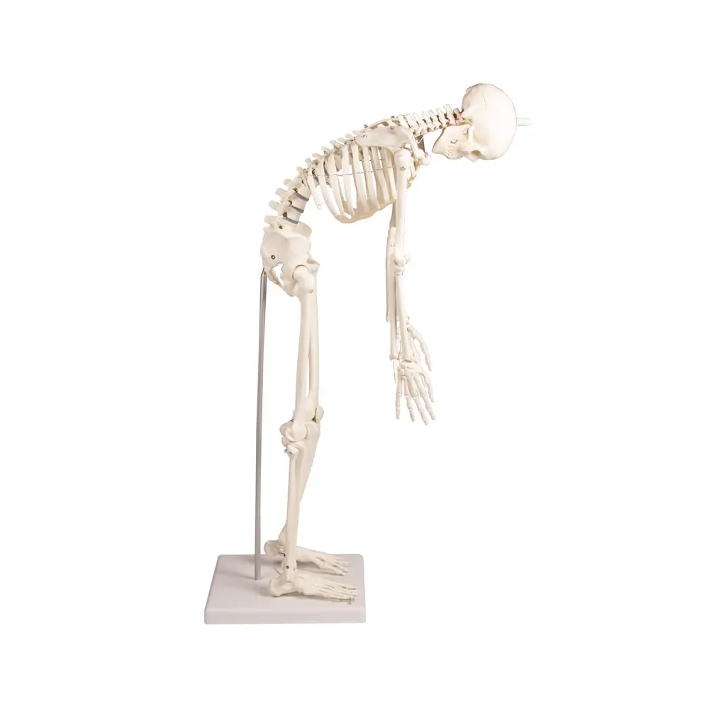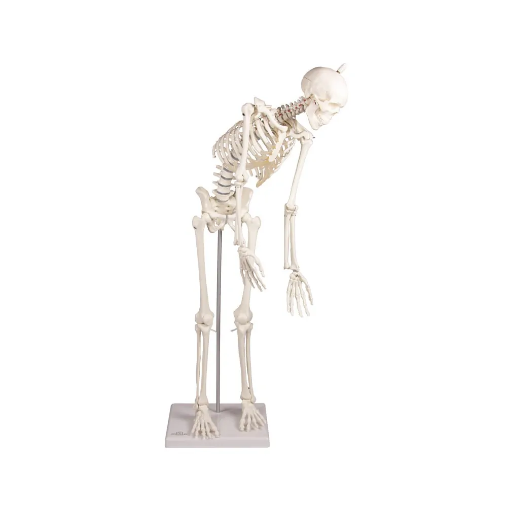 Scaled-down reproduction of a human skeleton in 1/2 life-size. Arms and legs are fully moveable; the Shoulder, Hip, Knee, and Ankle are mounted as sliding joints to allow natural movements. The three-part skull as well as the arms and legs are detachable. The legs can be detached at the knee and ankle. The spine is moveable and allows natural movements. Size without stand 84 cm. The model can be easily removed from the stand.